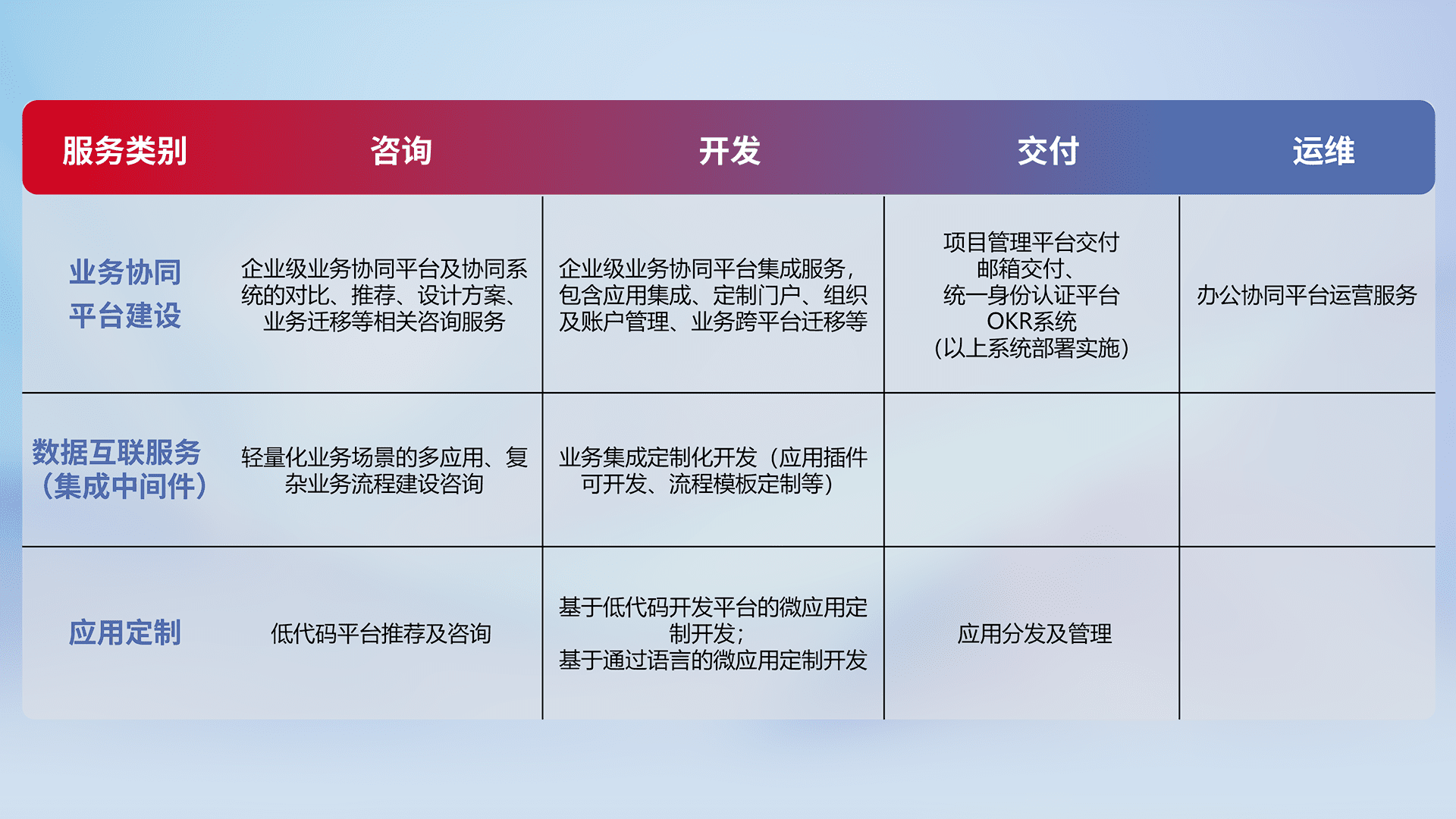 针对钉钉、、、、企微、、、、IDaas等平台级产品提供产品的规划、、方案、、交付、、、、定制化开发等服务,,,,实现如统一协同办公、、、智能客户服务、、、混合会议管理、、智能数据查询、、、等业务场景,,,实现数字化转型。。。。